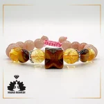 در ساخت این دستبند، از سنگهایی استفاده شده که نماد خورشید و انرژی فراوان هستند. سنگهایی مثل سیترین که به سنگ برکت و موفقیت معروف است و چشم ببر که نمادی از قدرت، تمرکز و انرژی مثبت به شمار میرود، در این دستبند به کار رفتهاند. این ترکیب سنگها به افزایش اعتماد به نفس، کاهش استرس و جذب انرژیهای مثبت کمک میکند.