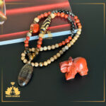 سنگ های تشکیل دهنده این محصول : جاسپر خاکی ، جاسپر قرمز ، حدید (هماتیت) ، عقیق ، چشم ببر ، عقیق سیاه با آویز چشم ببر و کلیپس نقره